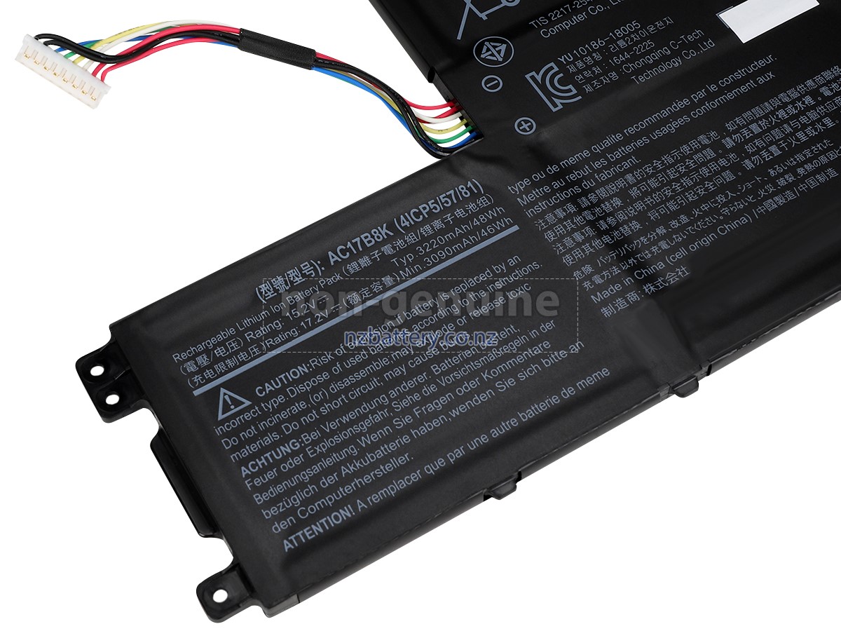 Our new Acer AC17B8K(4ICP5/57/81) replacement battery is made of the best battery cells and components. The batteries for Acer AC17B8K(4ICP5/57/81) supplied on the site nzbattery.co.nz are all passed the tests of UN38.3 and RCM, CE, UL, ROHS, ISO9001/ISO9002 and other international identification. To maximize decrease the risk of potential safety hazards, ensure the good experience of the users, our Acer AC17B8K(4ICP5/57/81) notebook batteries were incorporated protection measures as well. E.g, protection of temperature, circuit, Rests, over-voltage, hardware, output current limiting threshold, input and overcharge.