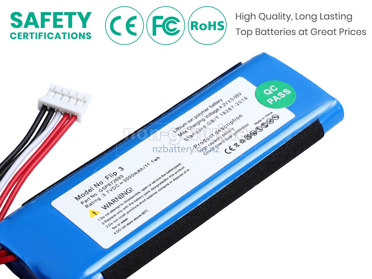 Our new JBL FLIP 3 PORTABLE SPEAKER replacement battery is made of the best battery cells and components. The batteries for JBL FLIP 3 PORTABLE SPEAKER supplied on the site nzbattery.co.nz are all passed the tests of UN38.3 and RCM, CE, UL, ROHS, ISO9001/ISO9002 and other international identification. To maximize decrease the risk of potential safety hazards, ensure the good experience of the users, our JBL FLIP 3 PORTABLE SPEAKER sound batteries were incorporated protection measures as well. E.g, protection of temperature, circuit, Rests, over-voltage, hardware, output current limiting threshold, input and overcharge.